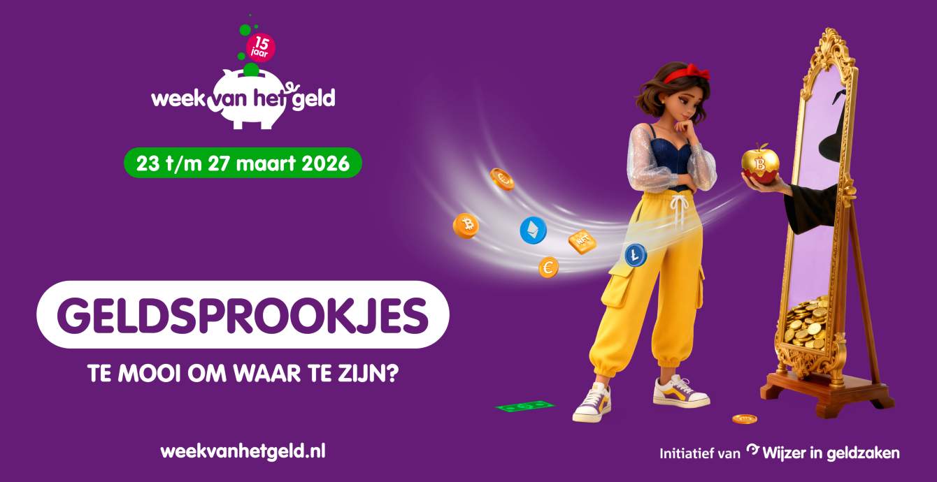 Tijdens deze 15e Week van het geld ontdekken jongeren met behulp van klassieke sprookjes in een modern jasje, hoe ze slimme geldkeuzes maken. Zo twijfelt Roodkapje of ze naar oma gaat of kiest voor de sale, terwijl Sneeuwwitje wordt verleid door de finfluencer-heks die haar met een bitcoin-appel gouden bergen belooft. Lukt het jouw leerlingen om niet betoverd te raken? Meedoen aan de Week van het geld is eenvoudig via onze gratis gastlessen en themapakketten voor het basisonderwijs, voortgezet onderwijs en mbo. Doe jij ook mee?
