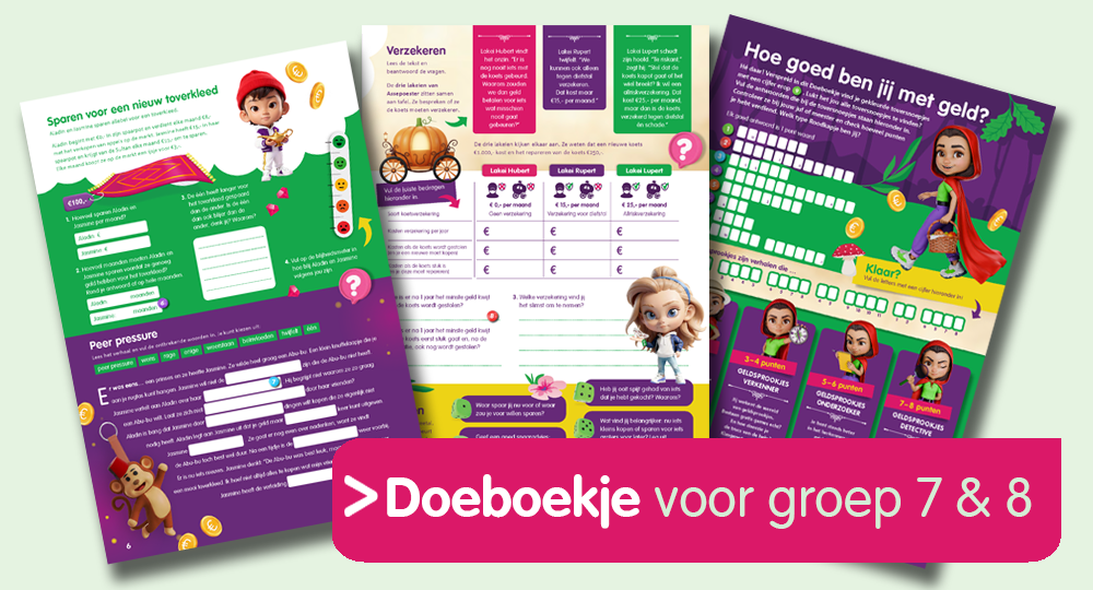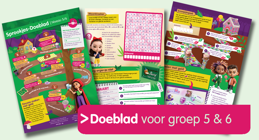 Sprookjesfiguren zoals Roodkapje, Hans & Grietje en Assepoester komen in dit Doeblad voor verschillende uitdagingen te staan. Kunnen jouw leerlingen Sneeuwwitje helpen met het sparen voor het bordspel Dwerg-erger-je-niet? Of Hans & Grietje met het maken van slimme keuzes bij het snoepjespad? Spelenderwijs leren leerlingen meer over geldsprookjes, reclame, bankzaken en in-game aankopen. Het Doeblad heeft in totaal 6 pagina’s en bevat zowel reken- als taalopdrachten.