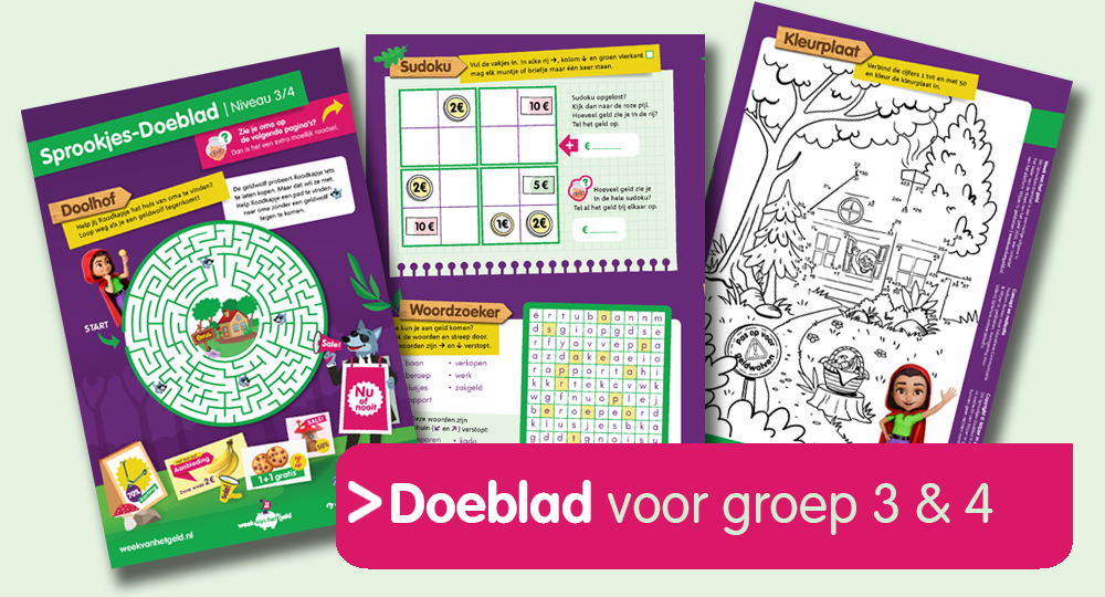 Roodkapje neemt in dit Doeblad de leerlingen mee op pad naar oma, maar onderweg komt ze allerlei puzzels tegen. Lukt het jouw leerlingen om de geld-sudoku op te lossen en Roodkapje veilig door het doolhof te begeleiden zonder geldwolfjes tegen te komen? Al puzzelend leren leerlingen meer over reclame, geld verdienen, geldwaarde en geluk. Het Doeblad heeft in totaal 6 pagina’s en bevat zowel reken- als taalopdrachten.